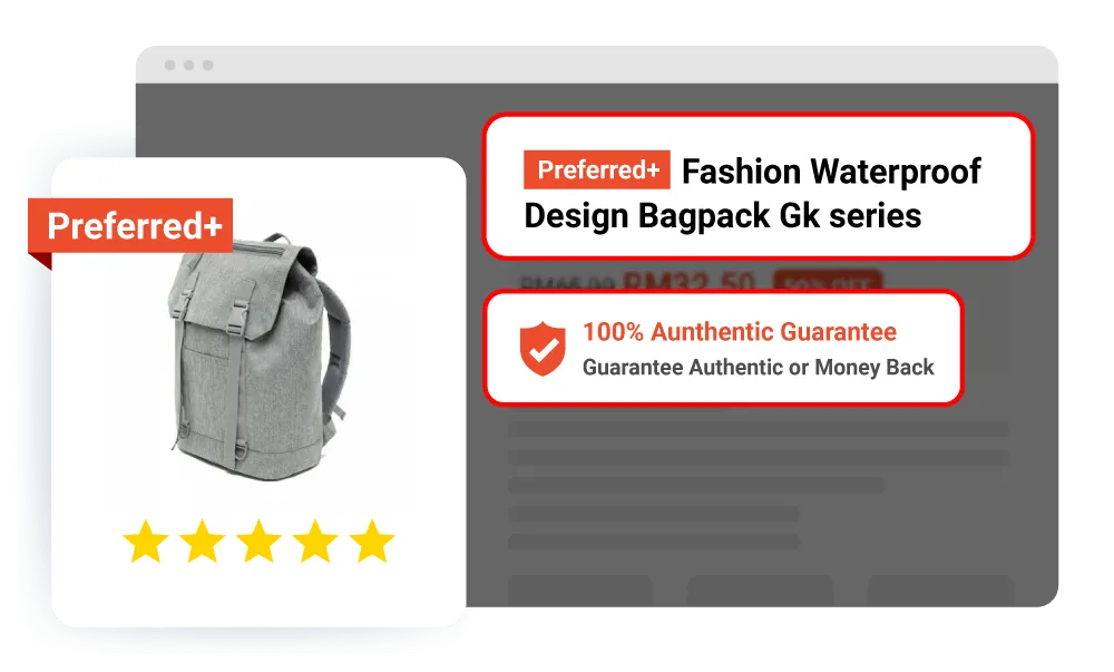 Once you have been selected to join the Preferred + Seller program, your shop and listings will be labelled with the “Preferred +” tag. In addition, all your product listings will be tagged with the “Shopee 100% Authentic Guarantee” tag.
