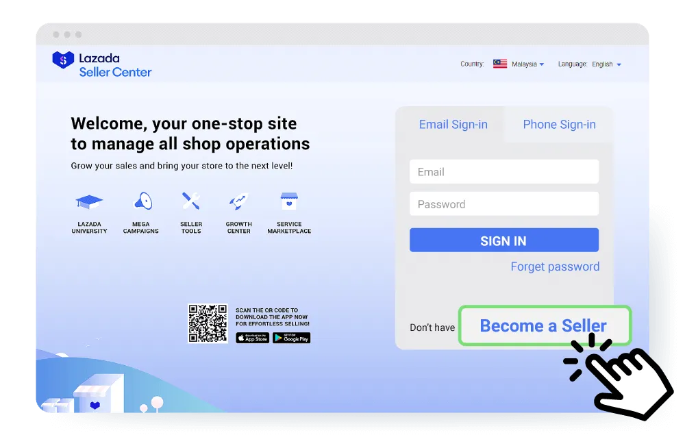 a. Click HERE to access the Lazada Seller Center and click on “Become a seller” to sign up for an account.