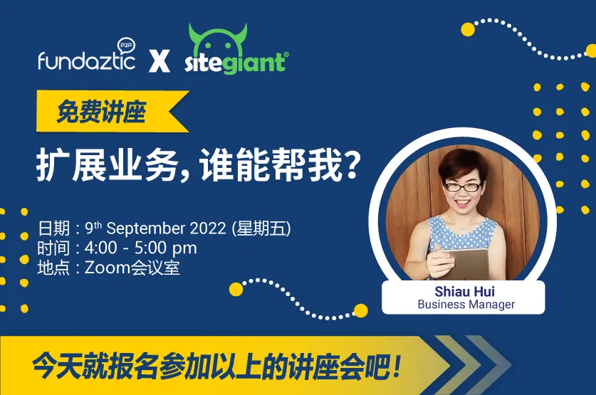 想要扩展业务却面对资金流不足?来报名参加这个由 Fundaztic 与SiteGiant举办的讲座会,了解如何通过P2P融资来扩展你的业务。