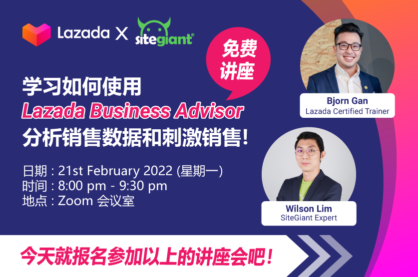 想要提升Lazada的业绩,却不懂得从何下手?来报名参加这个由 Lazada Certified Trainer, Bjorn Gan 与 SiteGiant Expert, Wilson Lim 所举办的分享会,学习如何使用Lazada Business Advisor 分析销售数据和刺激销售!