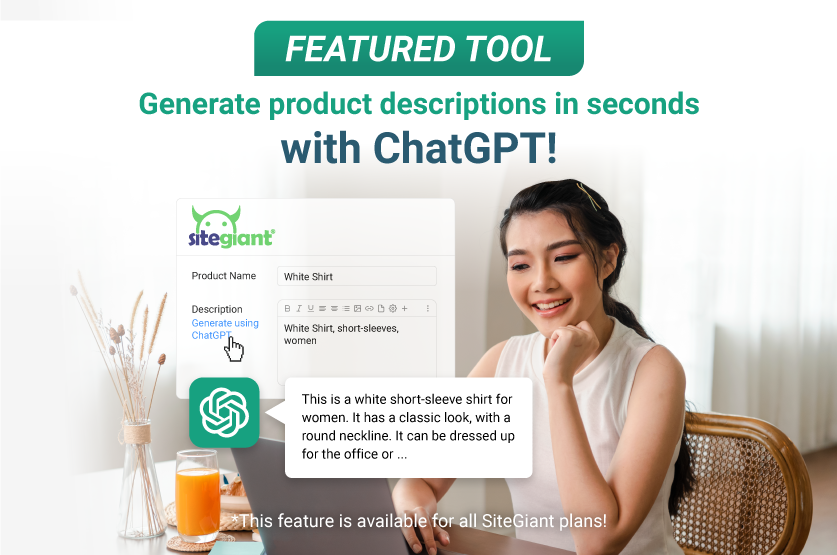 Don’t fret! ChatGPT integration is now supported in SiteGiant! With this exciting feature, you can generate product descriptions for your webstore listings, Shopee listings, Lazada listings and TikTok Shop listings in just seconds!