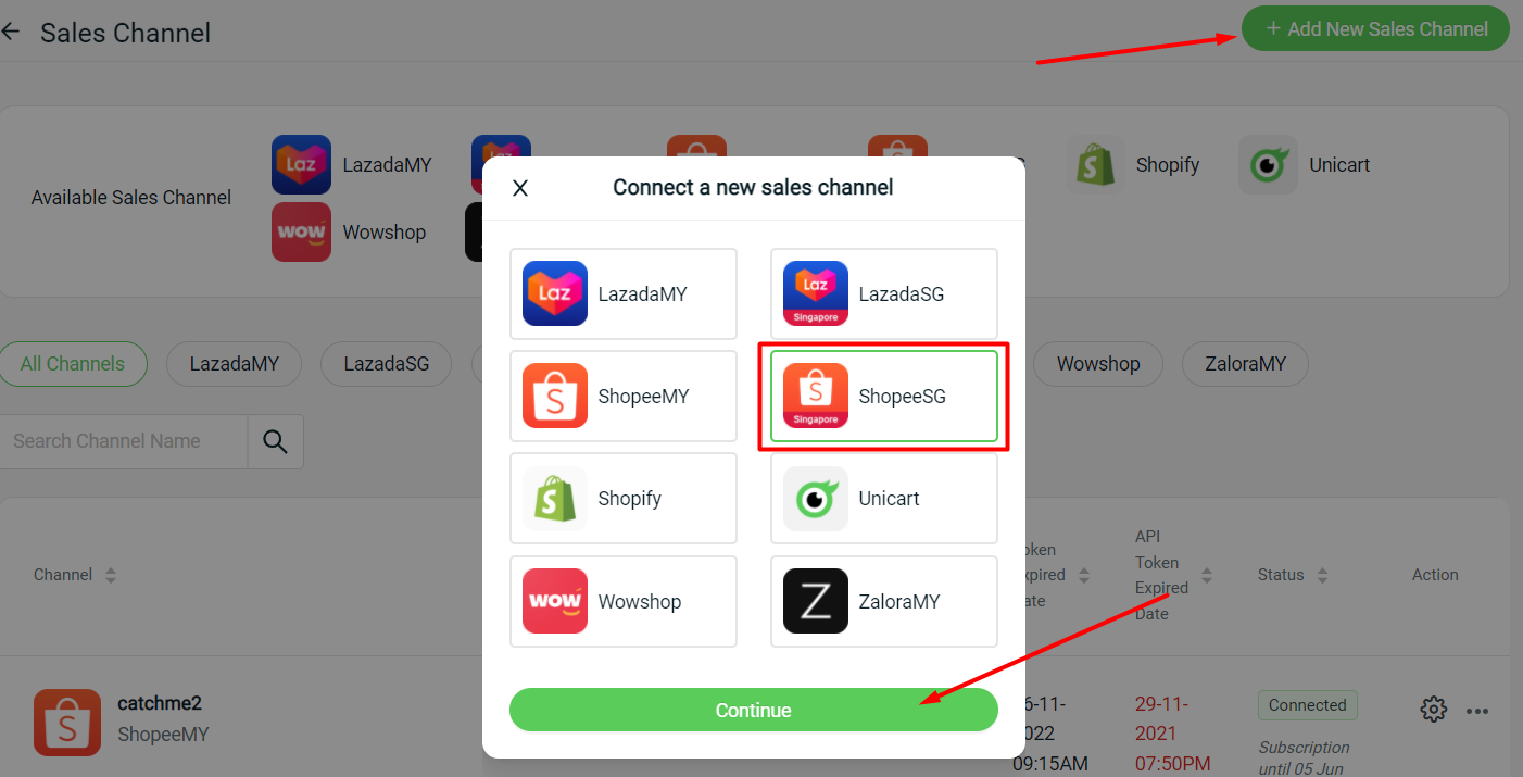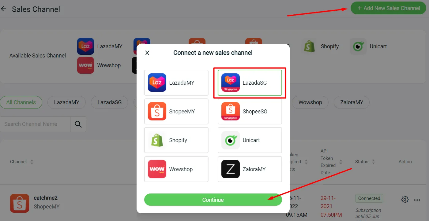 You may start selling and integrating your Lazada SG channels with SiteGiant under Settings > Sales Channels > Add New Sales Channels.
