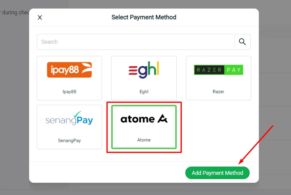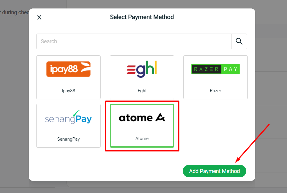 You may now activate and enable your customers to checkout on your webstore through Atome payment gateway under Settings > Payment > Add Payment Method.