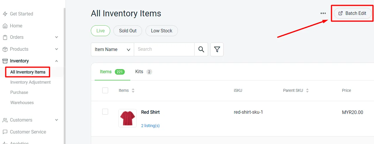 You may now use the Batch Edit to import/export inventory details and import stock amount under Inventory > All Inventory Items > Batch Edit.