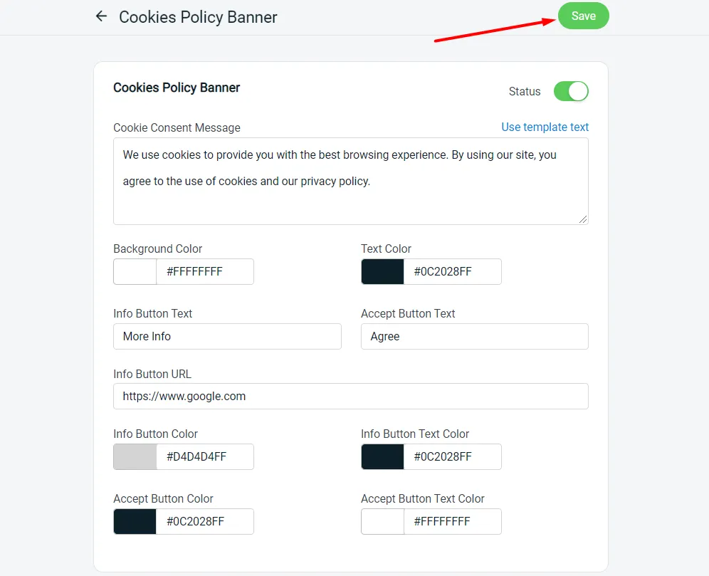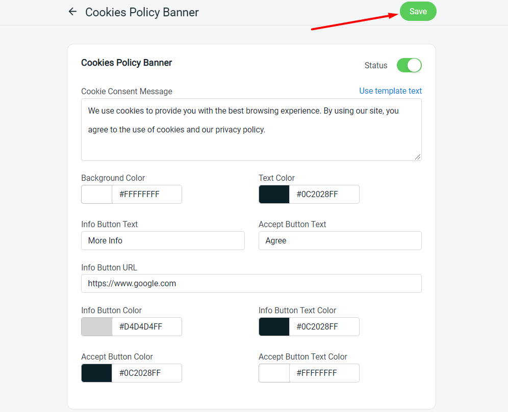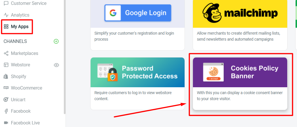 You may now inform and get your webstore visitors’ consent to use cookies under My Apps > Cookies Policy Banner.