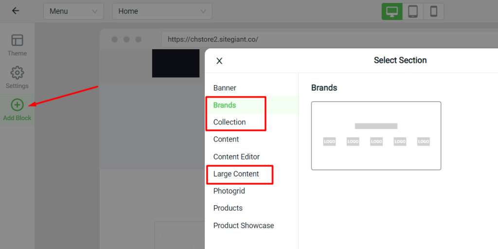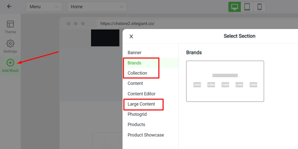 Brands, collections and large content options have been added under Webstore Builder > Add Block.