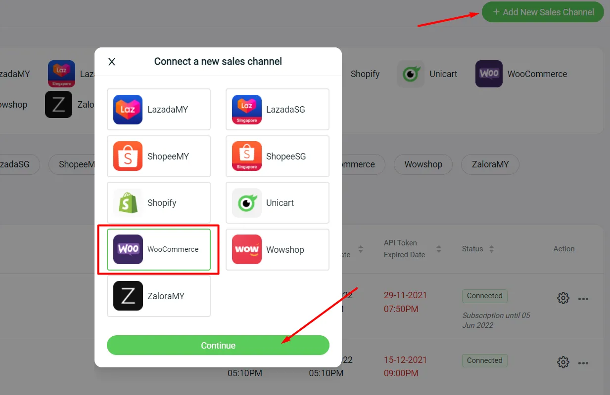You may start selling and integrating your WooCommerce channel with SiteGiant under Settings > Sales Channels > Add New Sales Channels.