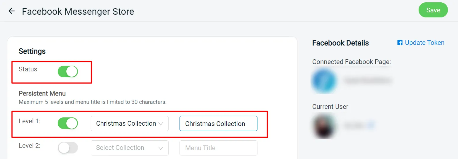 Step 2: Ensure your Facebook page token is updated and you may proceed to insert the product catalogue. Then, enable the status and save to allow customers to start purchasing through Facebook Messenger.