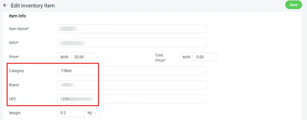 The category, brand and UPC (product barcode number) can now be inserted for your inventory details.