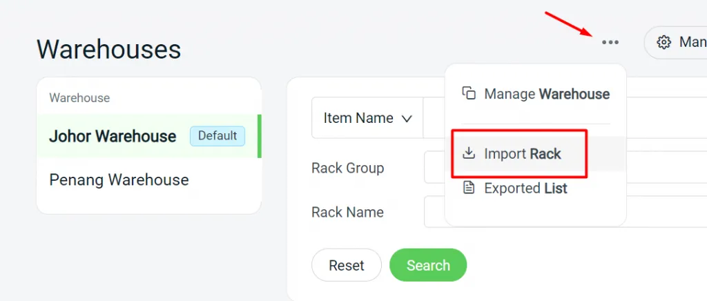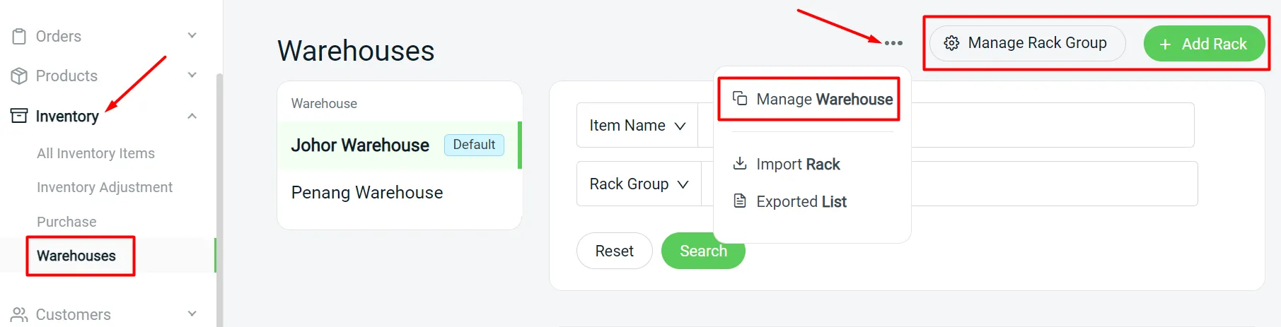 Warehouse and rack have been removed from settings. You may now create/manage your Warehouse, Rack and Rack Group details under Warehouses.