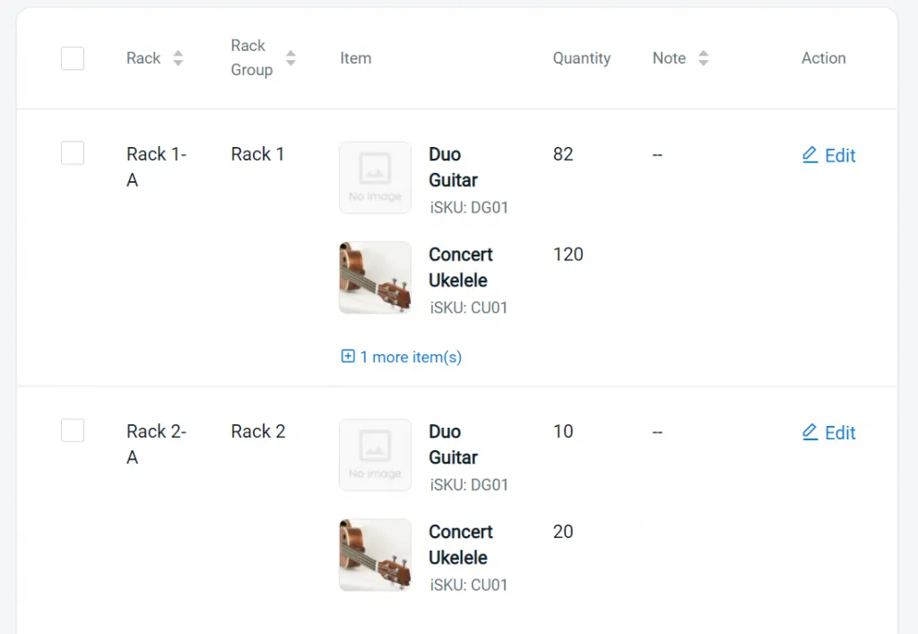 You may now identify all the items allocated to the respective rack and rack groups, view the item quantity and add notes for your reference.
