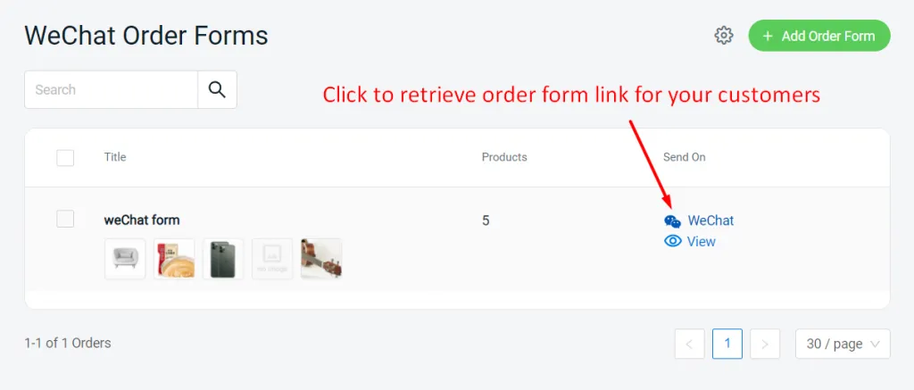 Step 3: Your created order form will be listed. Click on the icon shown to retrieve and send the order form link to your WeChat customers.