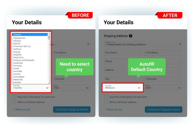 A lengthy customer checkout process may deter customers from making a purchase. To simplify the customer checkout process, you can now preset the default country where the majority of your customers come from. With this setting, your customers will only have to fill in their address and state without having to scroll and select their country. It would definitely save their time and effort.