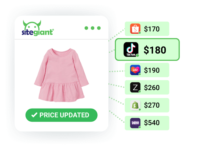 Flexibly adjust and update your product pricing all through one SiteGiant platform, without having to login to each respective channel.